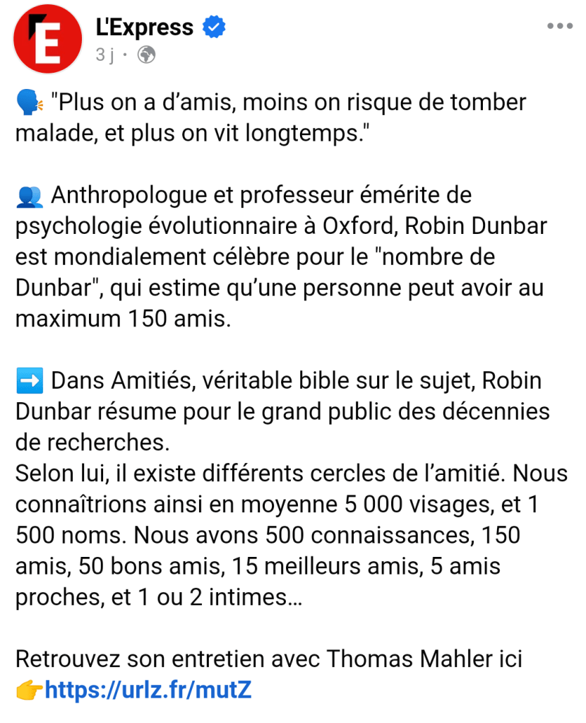 On connait/reconnait 5000 personnes en moyenne. Ce sont des connaissances essentiellement. ET on ne peut avoir que 150 amis maximum.